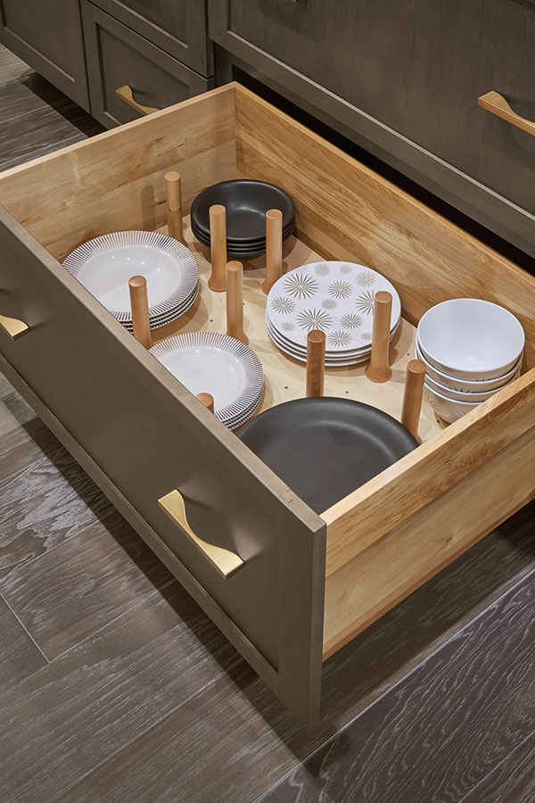 You will be surprised how many dishes a drawer can hold when it utilizes a clever organization method. Easily maneuver through dishware with the Pegged Dish Organizer.