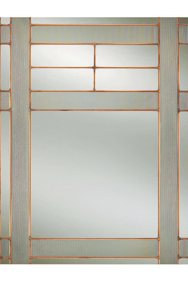 The Emery door style is a timeless standout, featuring Kinetic glass, clear glass and brass leading. Craftsman-era geometric designs give a nod to the Prairie style, providing this door a look of artistry.