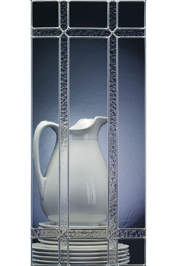 Linear in design, the combination of antique and granite-like chiseled glass add to this casual glass insert.