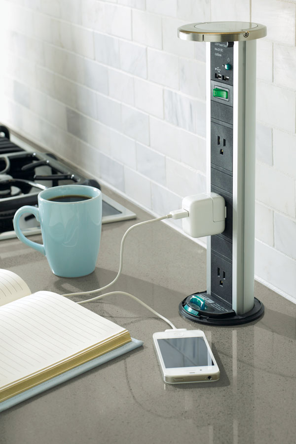 With a gentle pull, this Power Pod electrical source brings power to counter areas, featuring three electrical sockets and two USB ports.